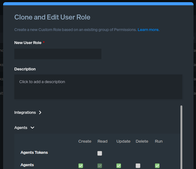 The new role can be created using a preexisting role as a template or from scratch. Any new custom role has the following considerations:
