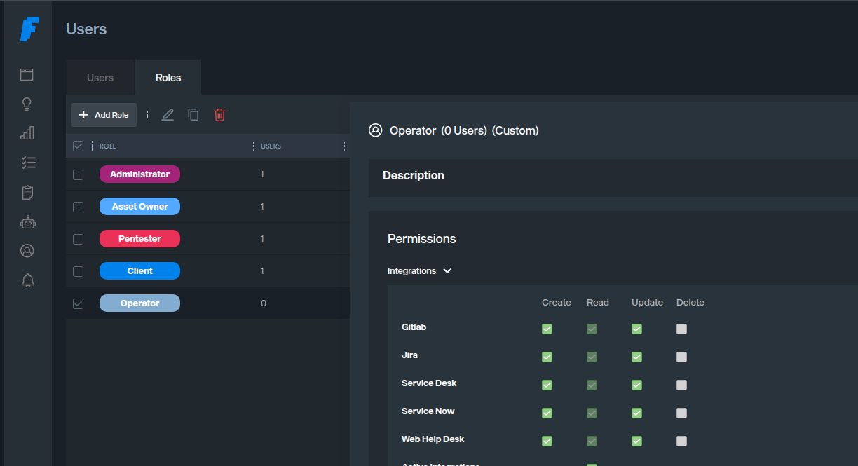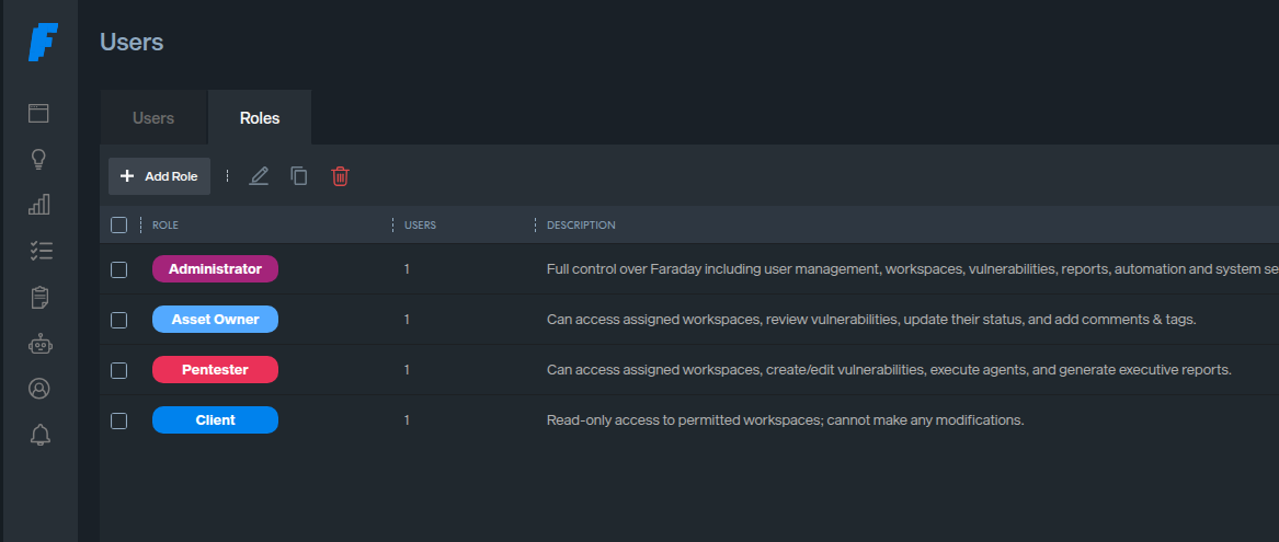 There are two types of roles in Faraday: native roles (Administrator, Pentester, Asset Owner, and Client) and custom roles.