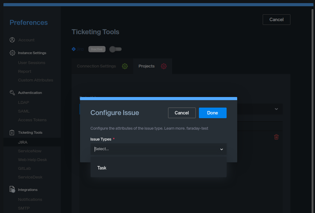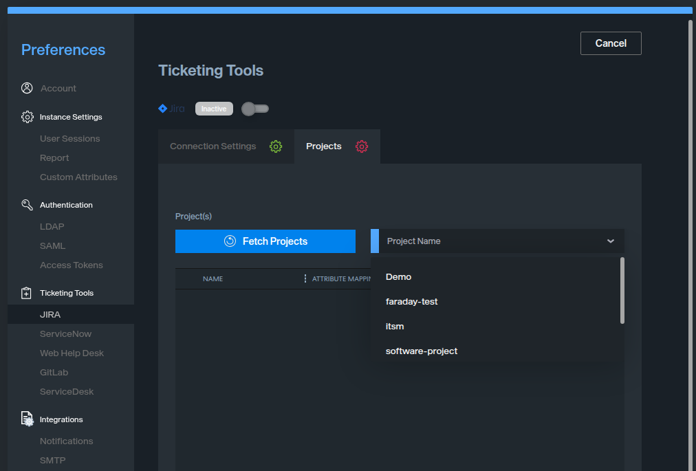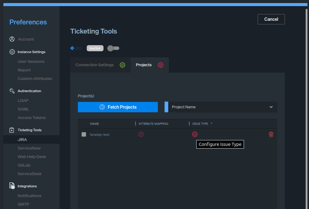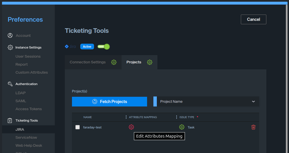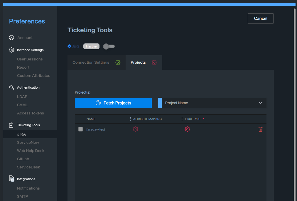 - Choose the Jira projects you want to interact/integrate with Faraday