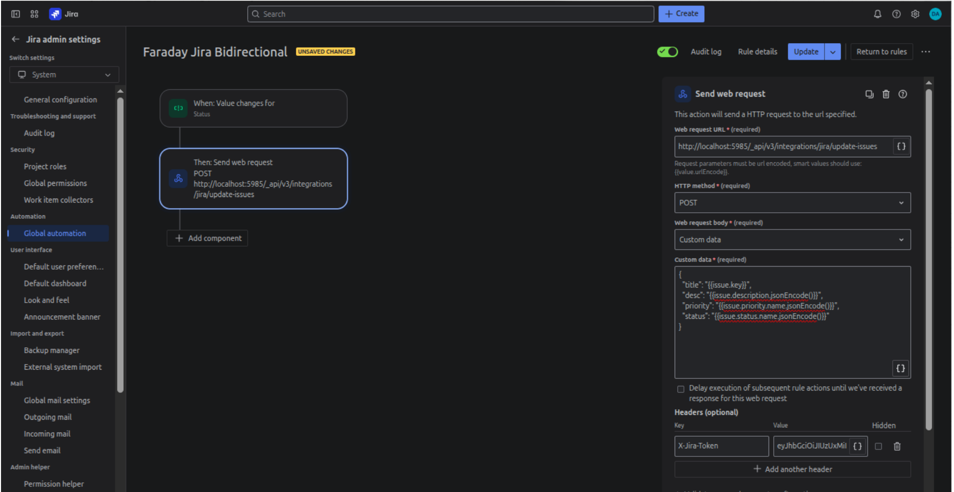 - Web Request URL: http://localhost:5985/_api/v3/integrations/jira/update-issues (assuming your Faraday instance is located at http://localhost:5985/)