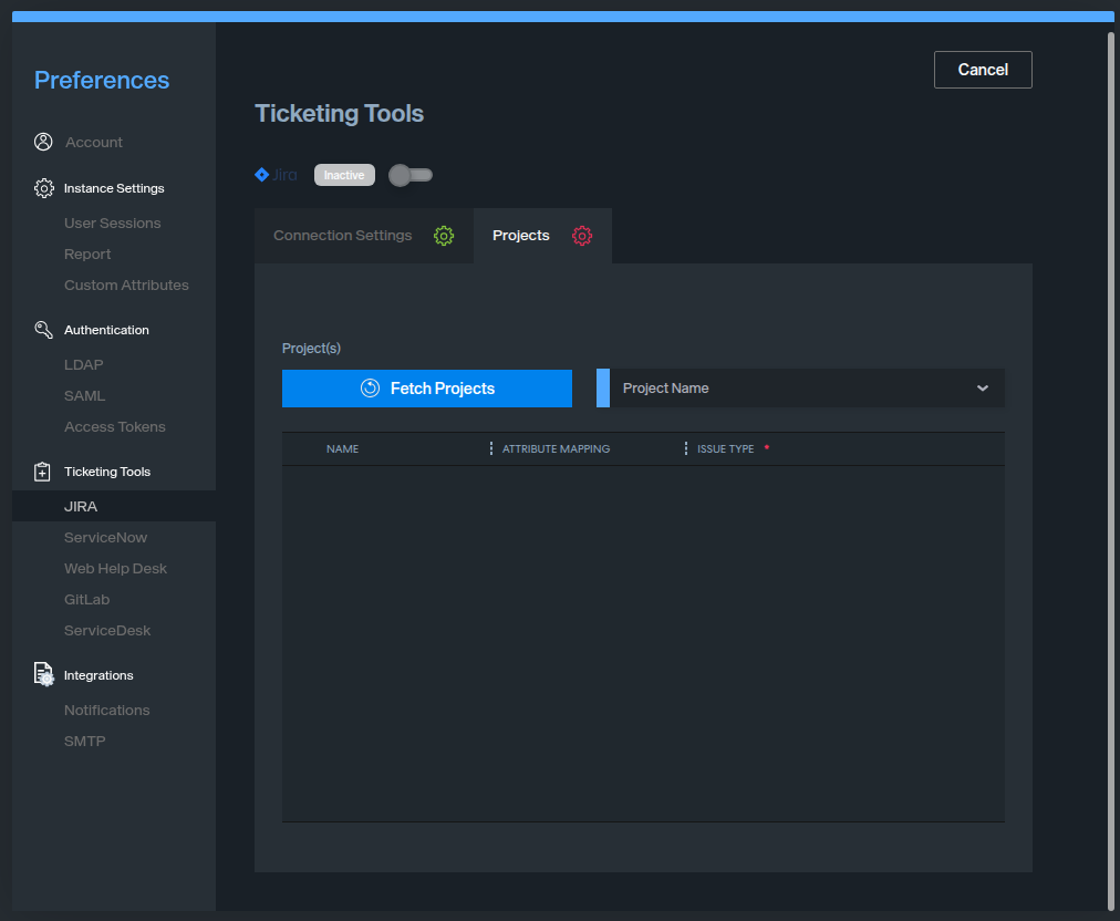 At this point, you can configure one or more Jira projects to send to your Faraday vulnerabilities. To begin, navigate to the Projects tab in the configuration.