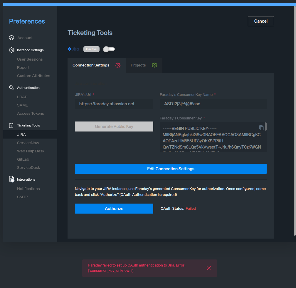After creating your application link, you are able to test your connection. To test the connection, go to your Ticketing Tools Jira configuration in Faraday and click on the Authorize button. If anything is wrong, you will receive a message like the following screenshot.