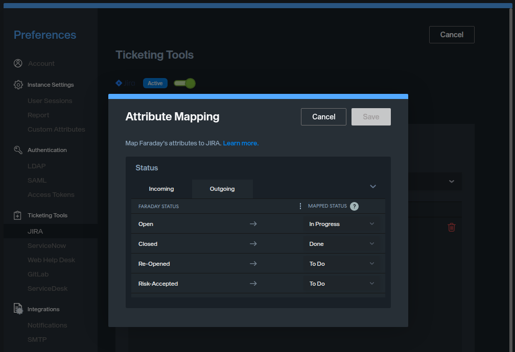 On the Incoming tab, you can match the new value for the status field (for a linked Faraday vulnerability), after a status transition occurs in Jira. The available statuses in Jira are the ones available in the project you are configuring. The available statuses in Faraday are: Open, Closed, Re-Opened or Risk Accepted. Once you select an option for some of the Faraday statuses (left column), an arrow will appear in the table with direction from right to left. Note: the Faraday status update, originated by this mapping, is not considered a manual update. This implies the update won't trigger another change in Jira.