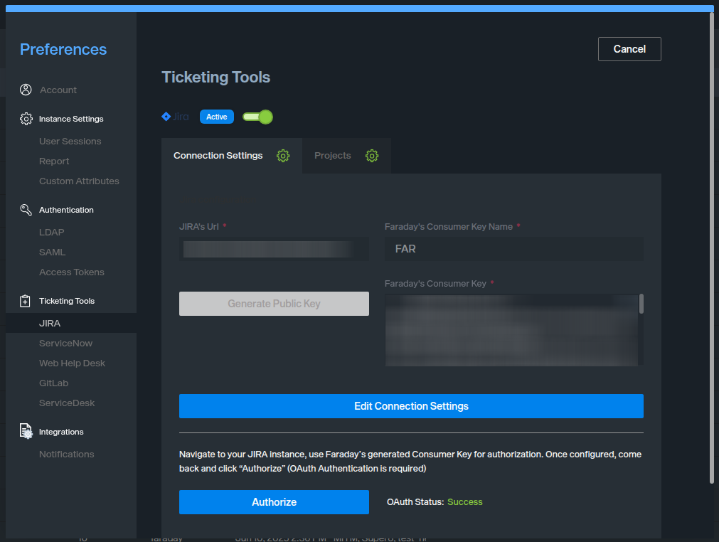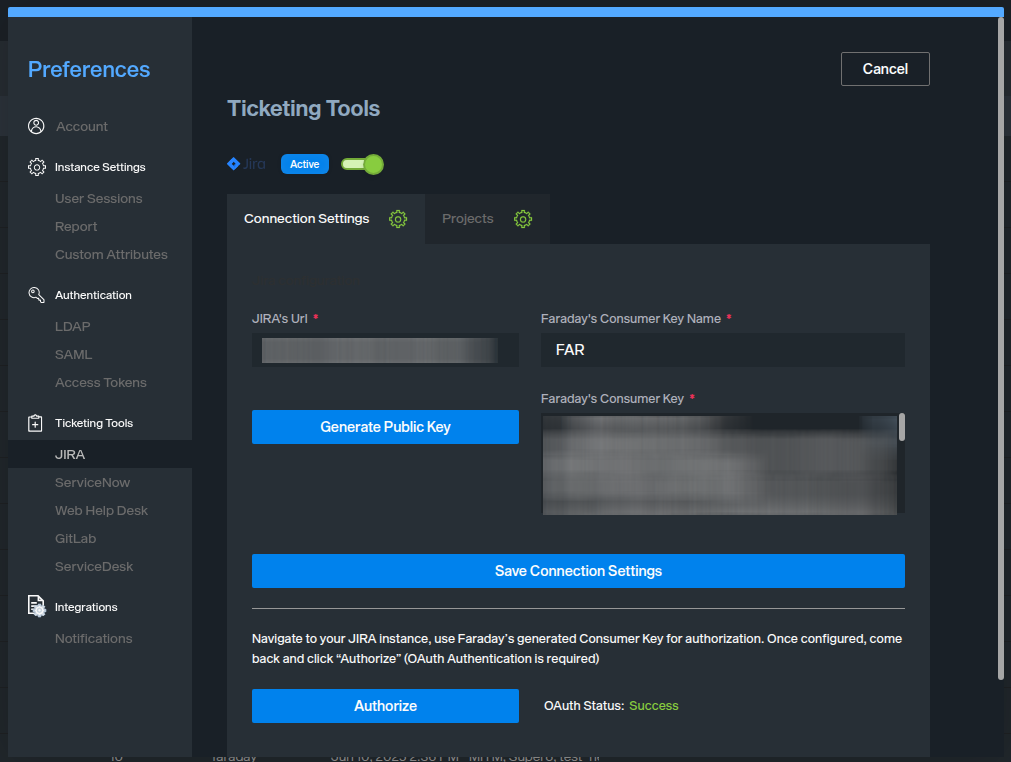 Copy your JIRA Instance URL and Jira Project Key information in the mandatory fields Jira Url and Faraday’s Consumer Key Name.